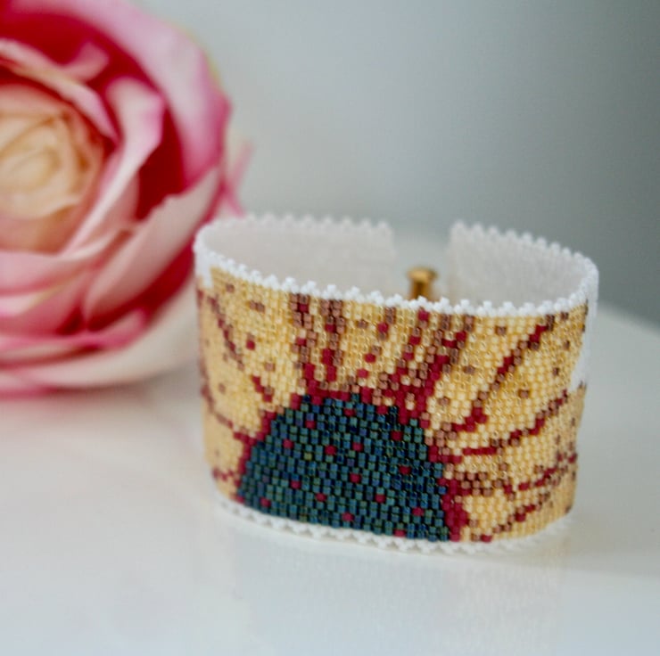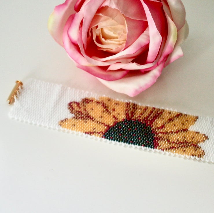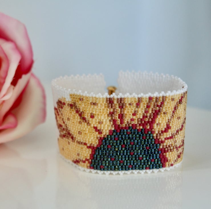 A beautiful hand beaded cuff bracelet with a sunflower design by Holly Kurzman.