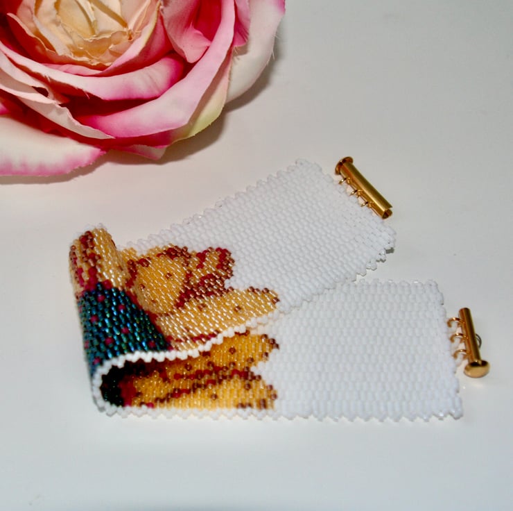 The bracelet is hand stitched using two-drop Peyote stitch with Japanese Miyuki Delica seed beads. The bracelet has a beaded picot edging and is finished with a gold coloured slide clasp.