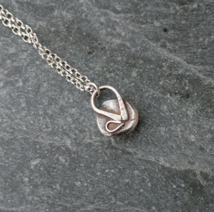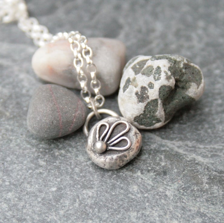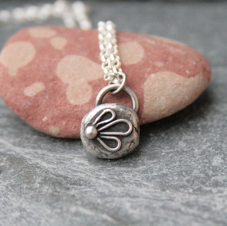 This dainty sterling silver flower necklace is made from recycled silver which has been melted down into a silver nugget and hammered into shape. I have added a little flower pattern with some silver wire onto the surface. The surface of the silver has been darkened with a patina which was then rubbed back to enhance the pattern.