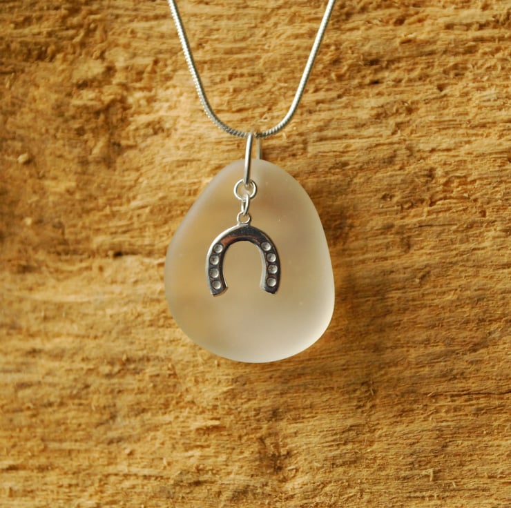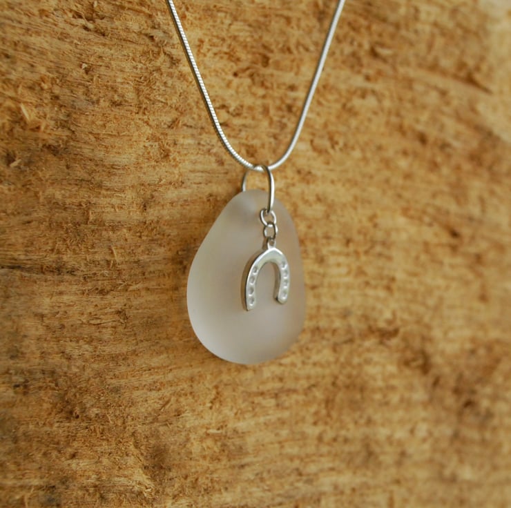 We try to match our charms to our pieces of tumbled beach glass and these two pair up beautifully. The shape of the old white glass, which has a few tiny bubbles in it, looks perfect behind the pretty sterling silver charm. The thick frosty glass picks up the light wonderfully and would look great against many background colours.