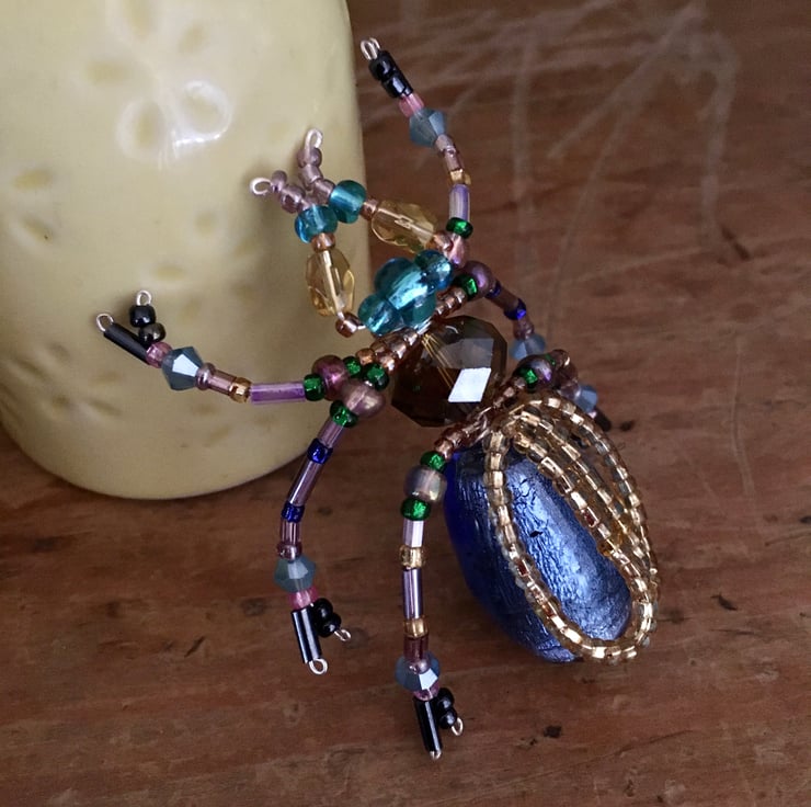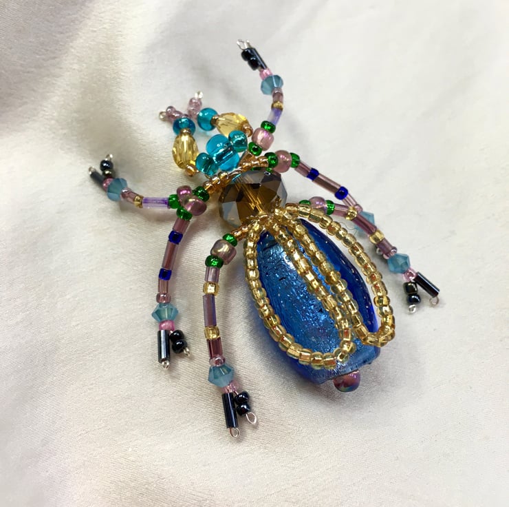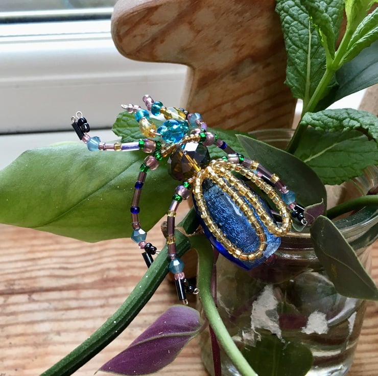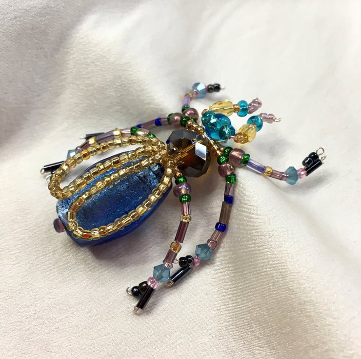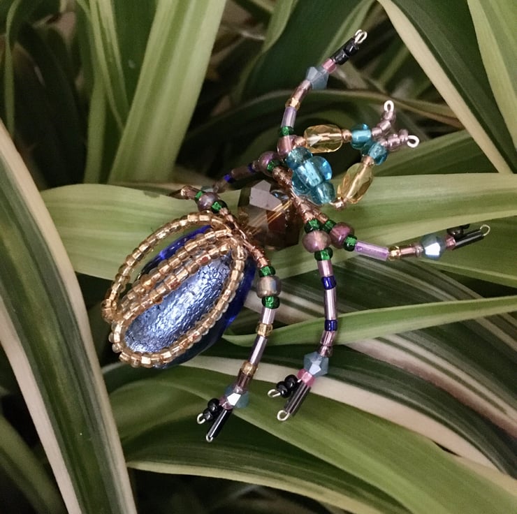 I have made this lovely 2” long jewelled insect with Italian foiled glass and tiny, gleaming beads.