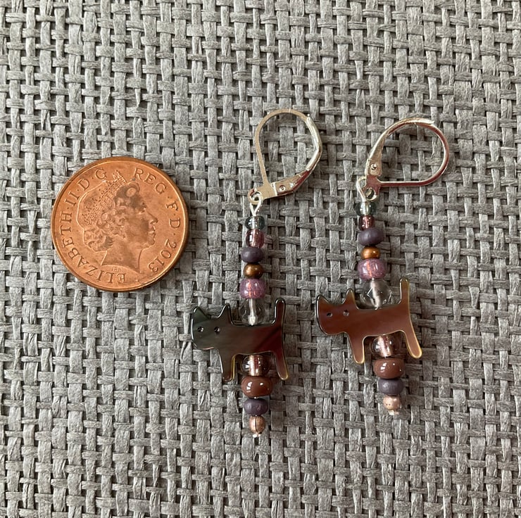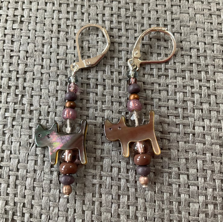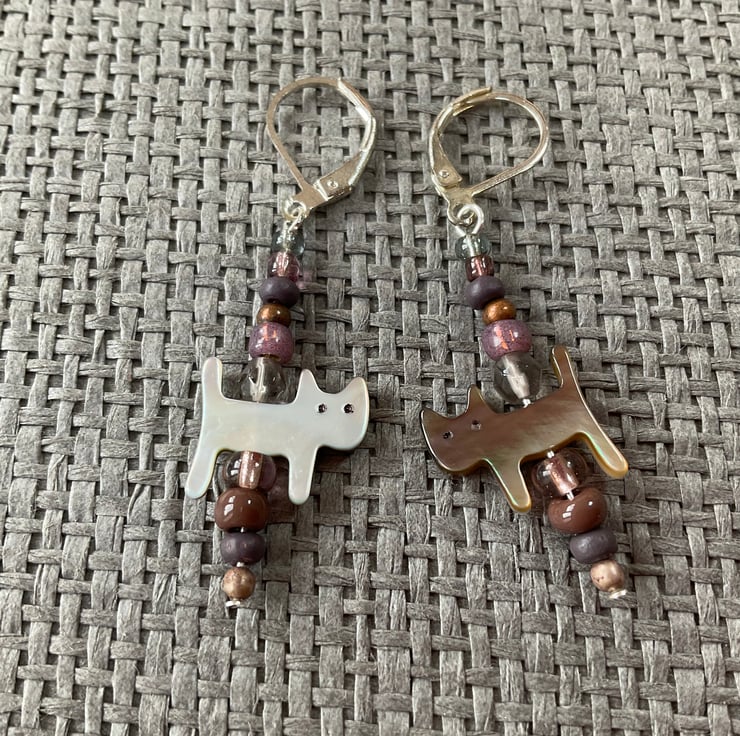 Silver-plated lever back earrings featuring Mother of Pearl cats and tiny glass beads in greys and muted, dusky pinks. They shine a slightly different shade of grey on each side.