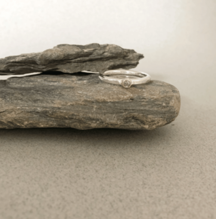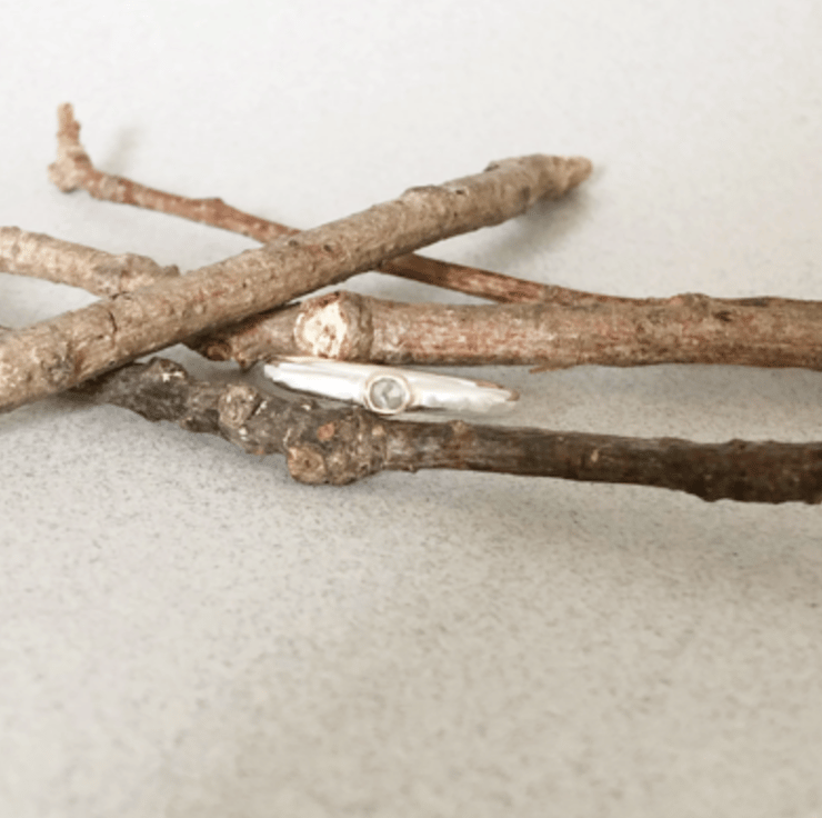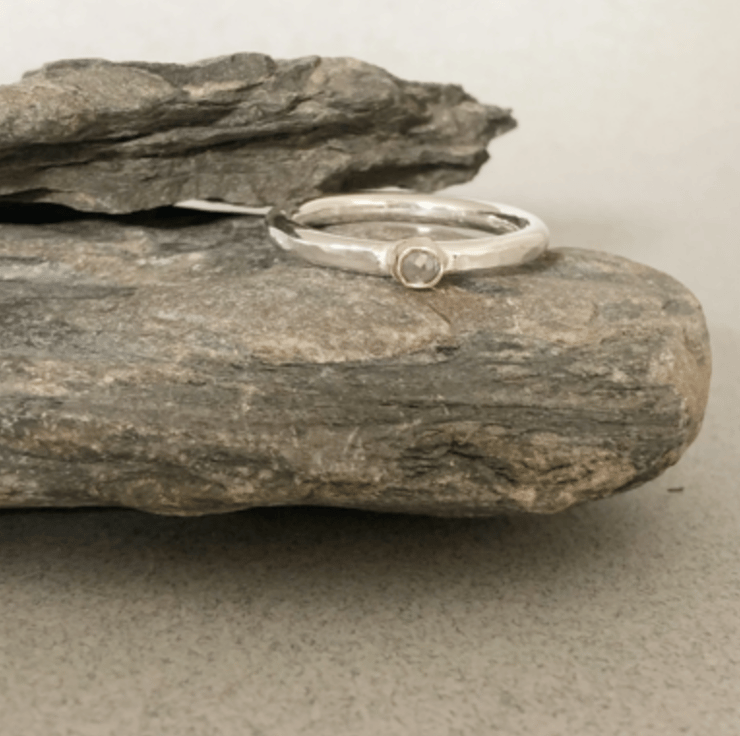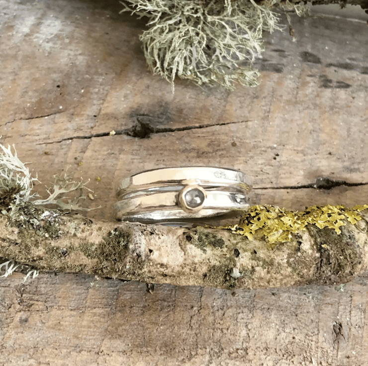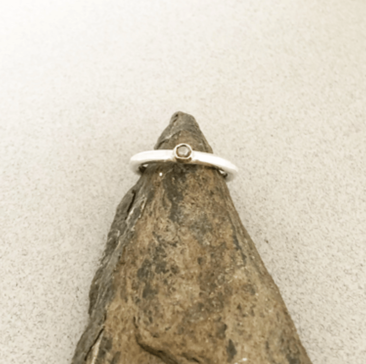 This grey diamond ring is a lovely piece of handmade, artisan jewellery. The diamond is a rose cut, 3mm-3.5mm grey diamond, surrounded by a 9 ct. gold setting The ring shank is a thick 3mm sterling silver wire. The diamond is bezel-set which allows maximum surface sparkle while protecting it from knocks and scratches.