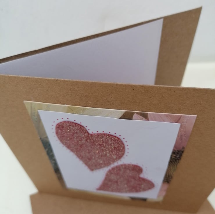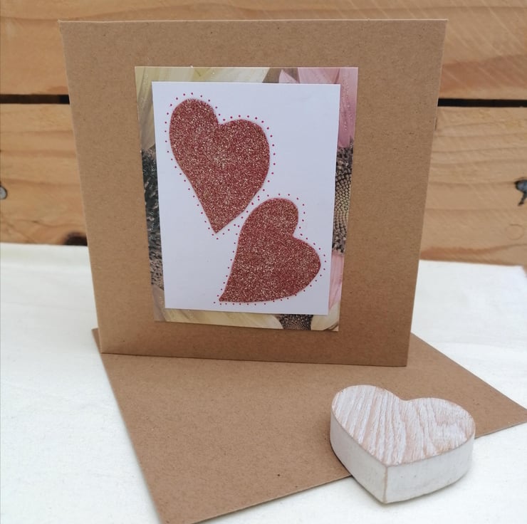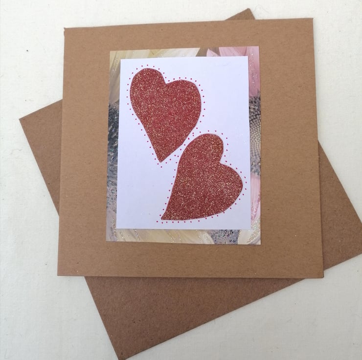 I have cut out the individually drawn heart shapes from a deep red coloured recycled glitter card scrap and mounted onto a recycled, floral piece of card. The hearts are attached to recycled card stock to create a romantic greetings card, ideal for anniversaries or special occasions.