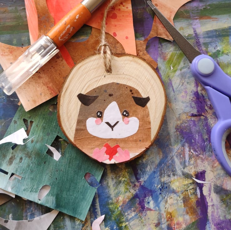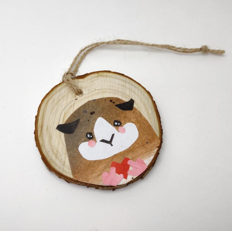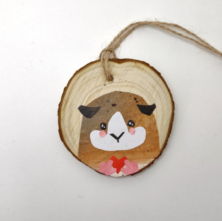 A wood slice featuring cute guinea pig art made from collage. Show someone you care with this adorable hanging decoration. A great gift for Valentine's Day or someone's birthday for anyone who loves guinea pigs.
