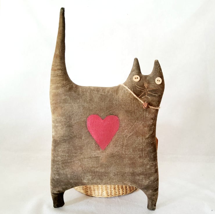 This chap ( who I originally named Puddin' ) is made from Osnaburg fabric which has been painted black , sanded and then given a heavy dose of coffee and cinnamon and after drying given another good old sanding. His face has been embroidered , the eyes are vintage linen buttons and the heart has been painted with acrylics. He has been finished with a bit of jute twine and a rusty bell.