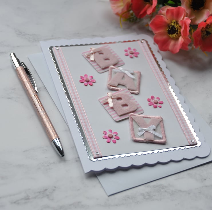 This mixed media design is the word Baby spelt out in pink 3D fabric letters which have been made to look shabby chic. The letters are adorned with bows and are mounted on mixed media of fabric and coordinating card. The card is finished with matching pink gingham ribbons, pink flowers, silver foiling, and gems.