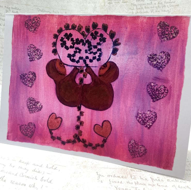 This print has been taken from an original artwork on canvas in acrylics. It features a pair of sloths climbing up a heart shaped tree, with heart shaped leaves. The background is a wonderfully colourful mix of pink acrylic paints some with interference shimmer, that looks blue on an angle. Textured hearts are featured down each side, with a touch of glitter on them for extra glamour. The sloths themselves, are painted in shades of dark red acrylic paint.