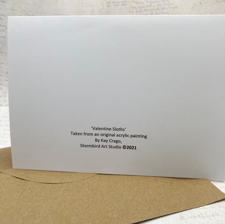 How cute are these pair of Sloths! This greetings card has been printed from an original mixed media artwork in acrylics by Kay Crago of Stormbird Art Studio.