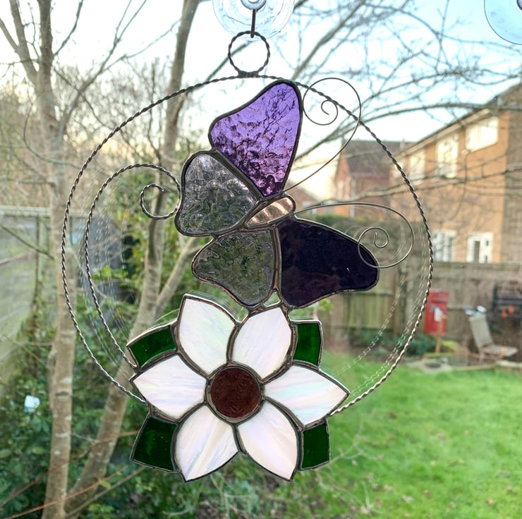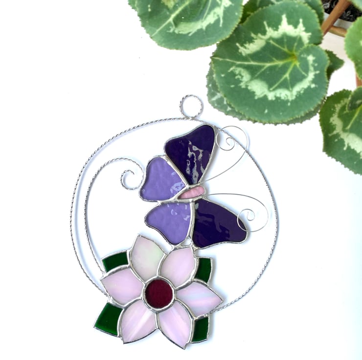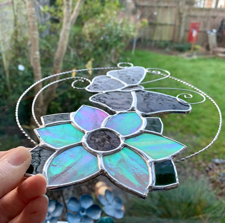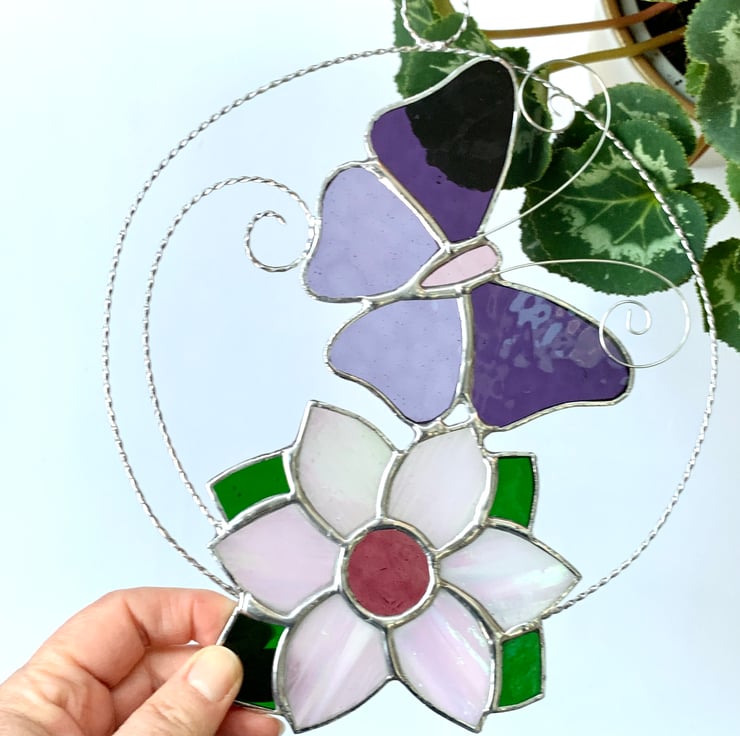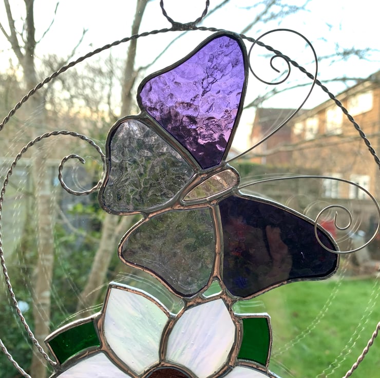 The butterfly has been made from purple corella glass and mauve muffle for the wings and pink muffle glass for the body. Twisted wire has been used for the antenna. The flower has been made from irridised white streaky sea glass which has a pinky sheen you can see in one of the photos with dark pink florentine glass for the centre and green sea glass for the leaves.