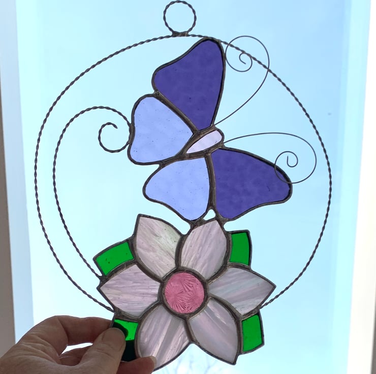 I found the pattern for this flower and just can’t help but incorporate it in different suncatchers, this one with the ever popular butterfly.