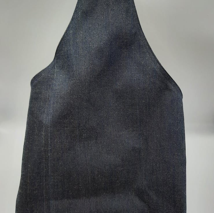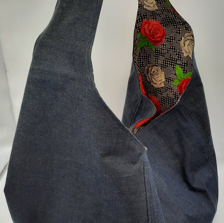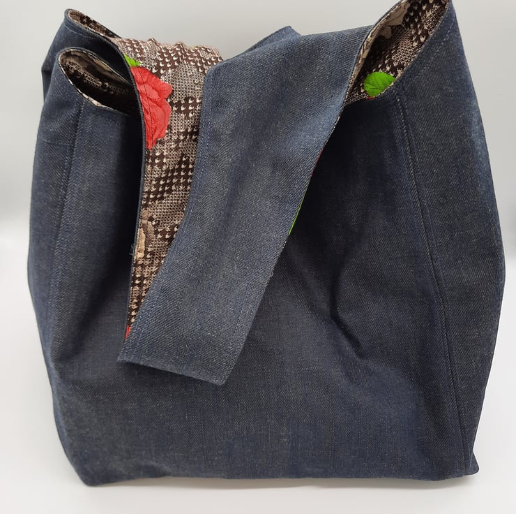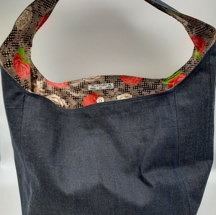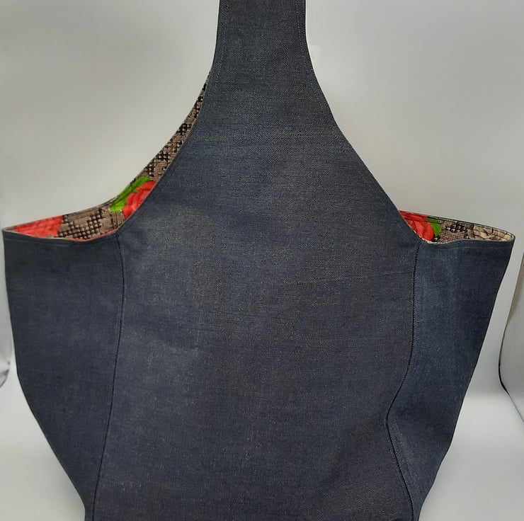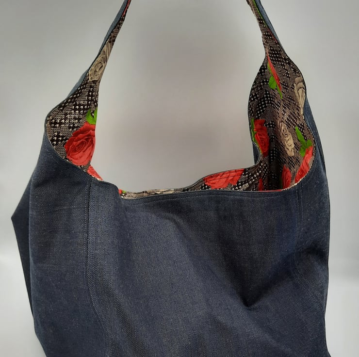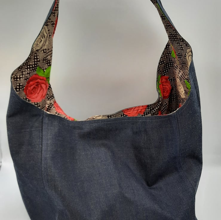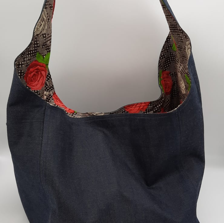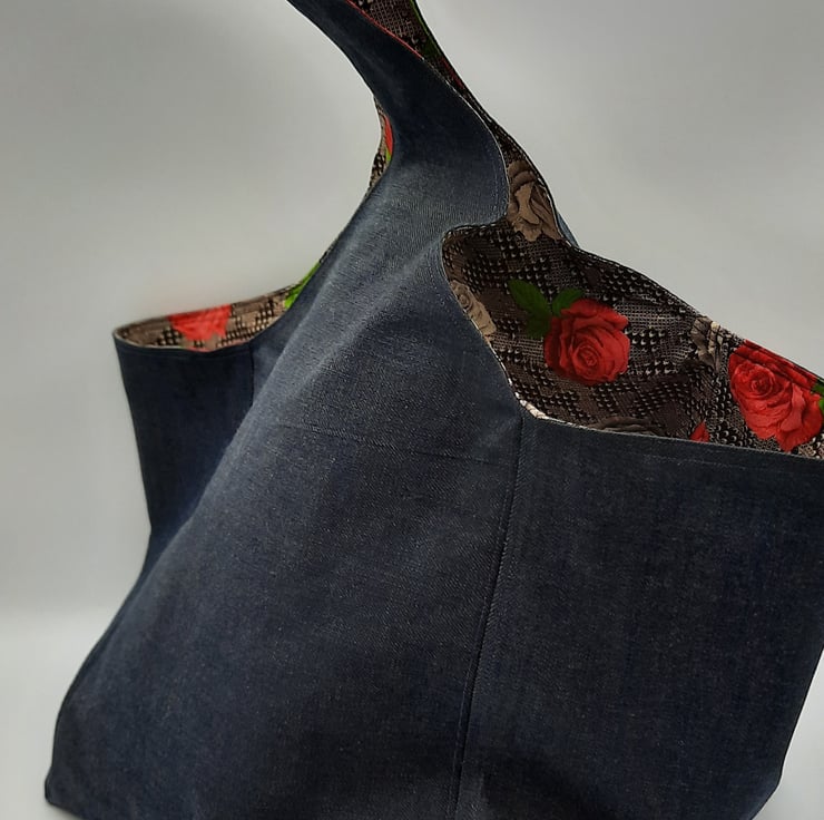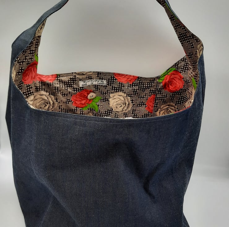 Large dark denim hand bag with raspberry red and cream rose cotton lining.