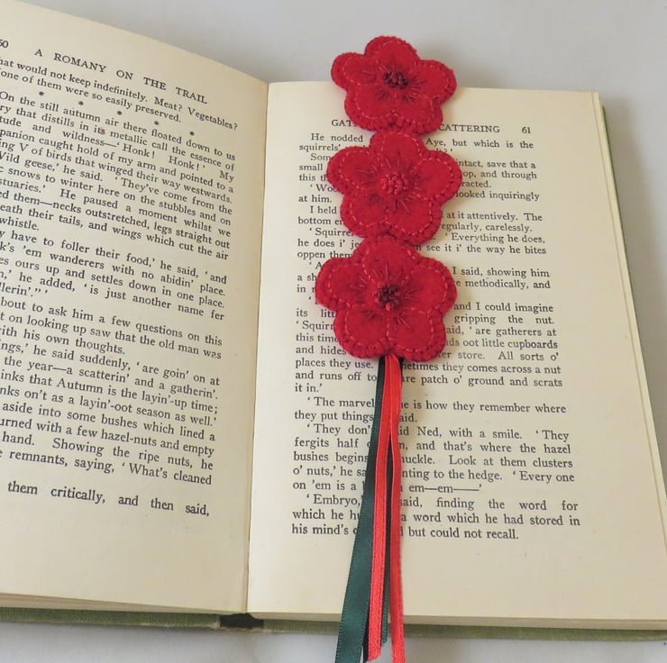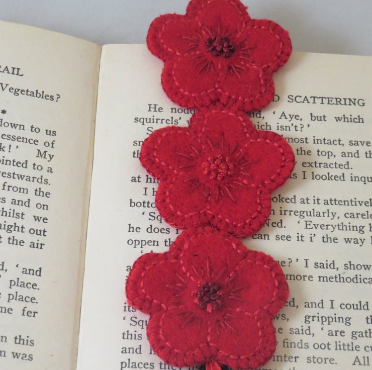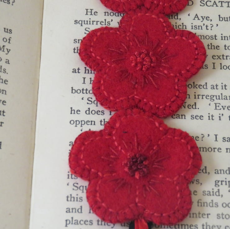 Flower shapes were cut from recycled wool fabric from a no-longer used coat. Details of the flowers were added by embroidery using cotton threads. The french knots in the centres of the flowers were stitched in a space dyed vintage perle thread with a lovely gradation of red shades. Each flower was then backed with red felt - from a collection of commercial offcuts and blanket stitched around the edge to complete. Three flowers were then stitched together in a chain to form the bookmark.
