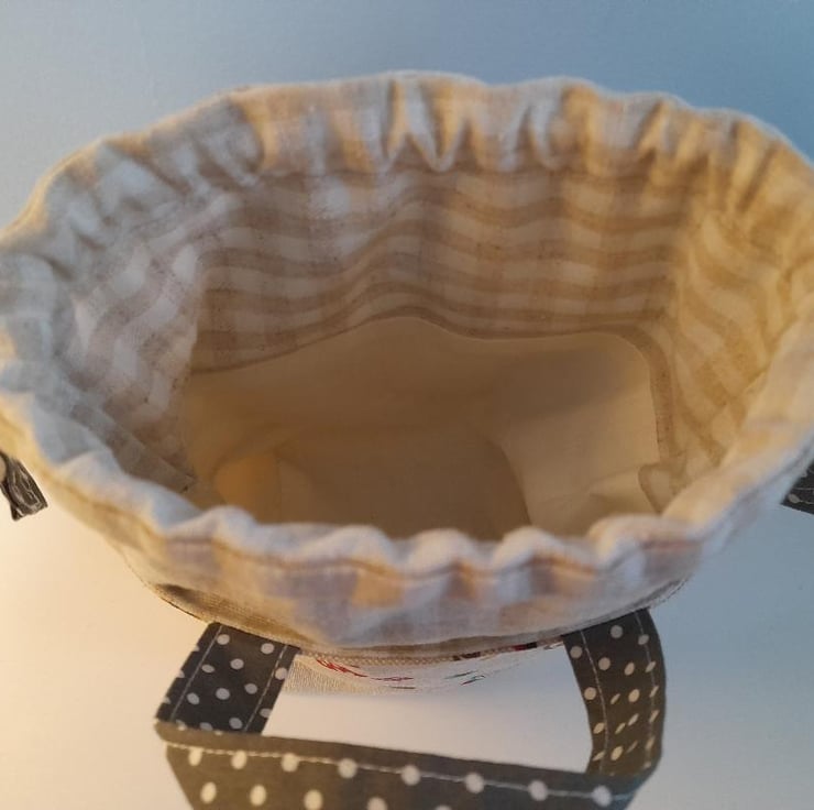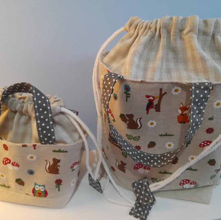This bag is a fully lined, drawstring cotton bag for a multiple of uses. The fabric is a wild animal medium weight cotton which is sturdy and robust. The bag is fully lined with a contrasting fabric. The drawstring is made of cotton rope.