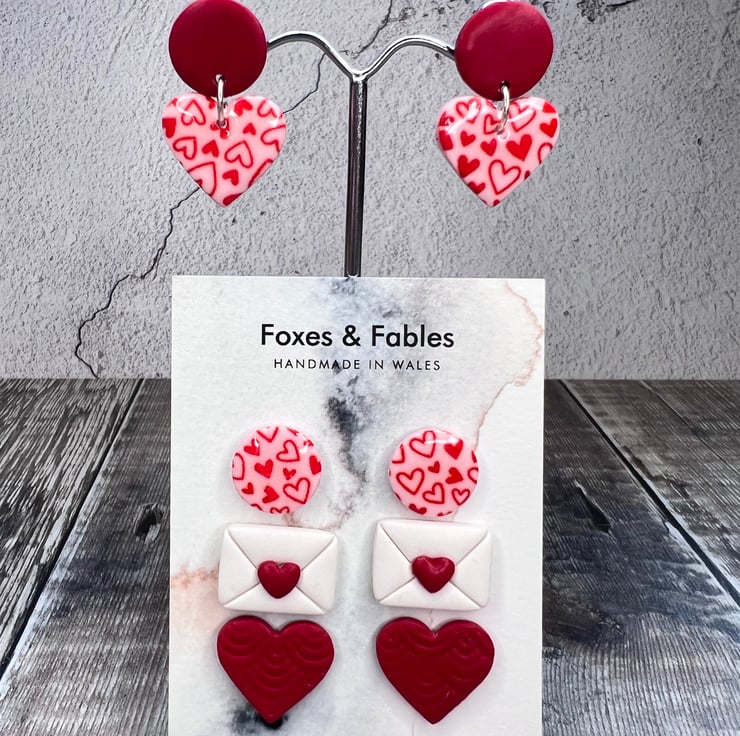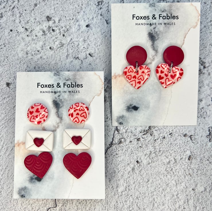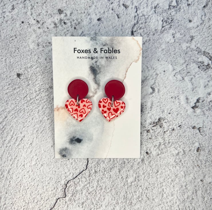 Handmade heart stud earrings made from polymer clay. Small round red stud with a slightly larger pale pink heart screen printed with a red heart pattern. The heart has been topped with resin to seal in the heart print.