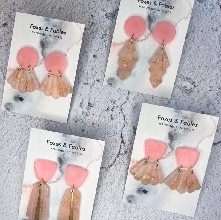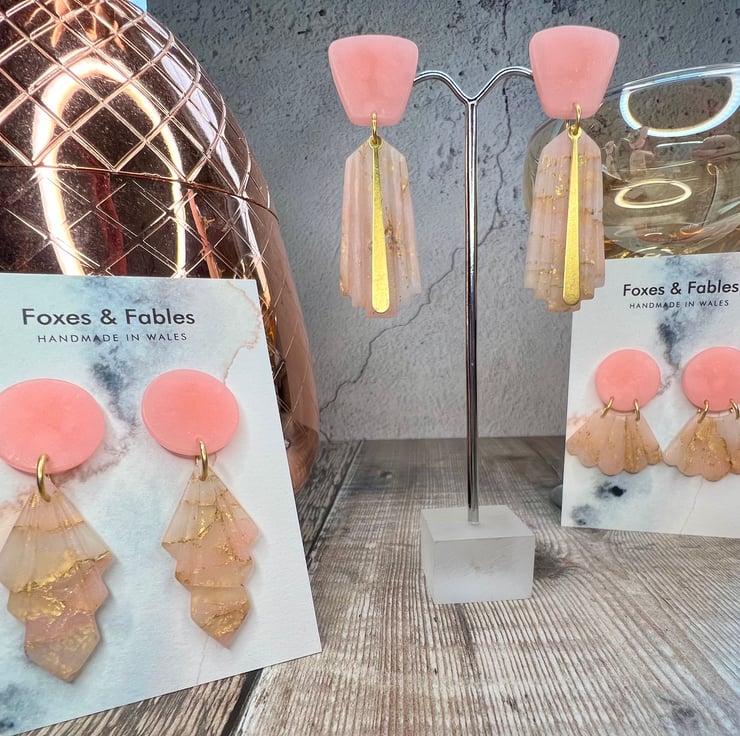 Gorgeous handmade Art Deco style polymer clay earrings. Made using alcohol inks and translucent clay for an ethereal effect. The earrings are a mix of translucent pale pinks and gold leaf in an Art Deco triangular chandelier shape.