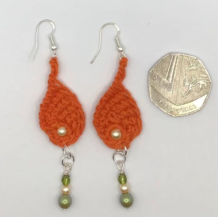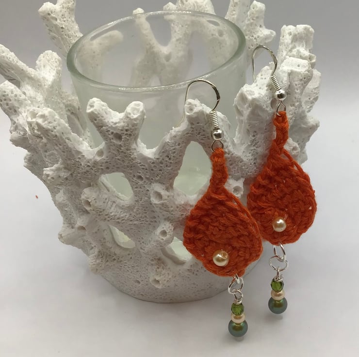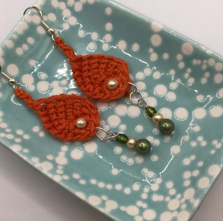 Gorgeous hand crafted using Tunisian style crochet technique one of a kind, small fish dangly earrings, with Czech glass pearls and crystals adorning these super cute unusual earrings. Made with pure cotton yarn and 925 silver hooks and silver plated findings, add a sense of fun when wearing these. Length from top of hook to bottom of earring is approx 8cm long.