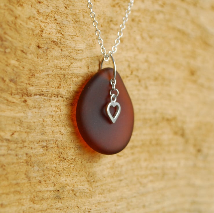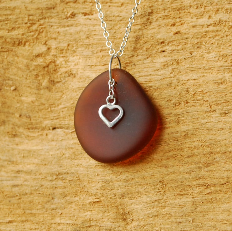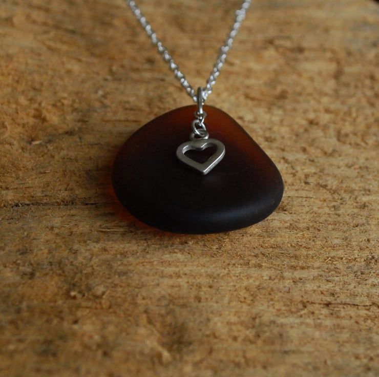 We chose this piece of tumbled beach glass for this heart charm pendant because the shapes go perfectly together. The glass has come from an old bottle and curves gently behind the sterling silver charm. This piece of glass has come from a very thick bottle to have worn down to such a beautifully rounded shape.