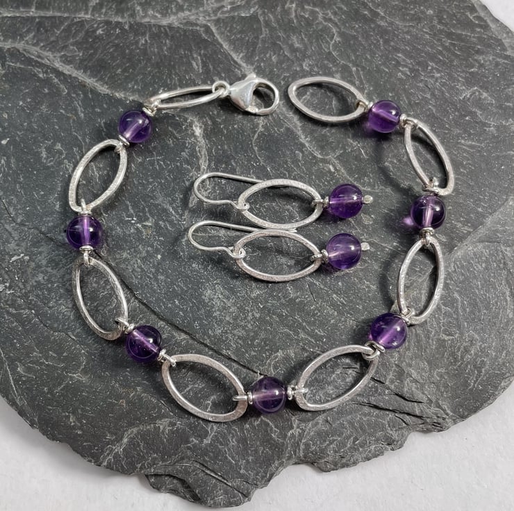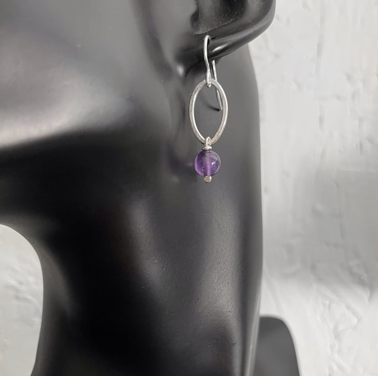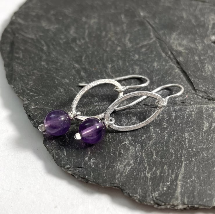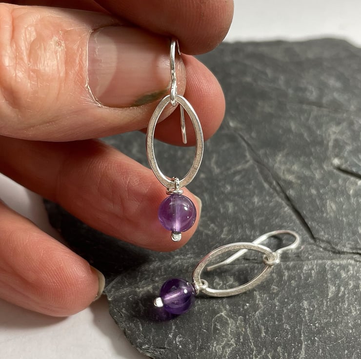 Simple lightweight earrings. A hammer textured oval of silver with an amethyst bead dangle.