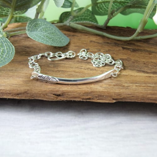 The bracelet centre piece hass a lovely rounded feel and is made from 3.2mm x 1.6mm solid sterling silver oval wire which I have cut, shaped, sanded and drilled, at one end I have soldered a small feather for added detail. Securely soldered to sturdy sterling silver chain with hook clasp closure.