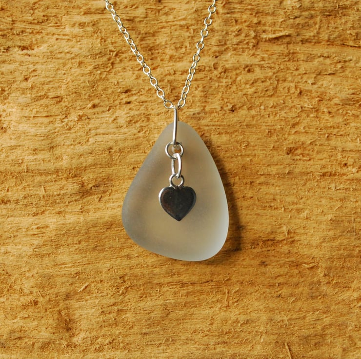 Grey is one of the rarest colours of beach glass. We've only ever found thick pieces of grey glass, which we think have come from some kind of glass containers. Grey was never a popular colour for domestic glass and we have never come across a grey bottle. This beautiful piece of tumbled glass curves gently behind a sterling silver heart charm.