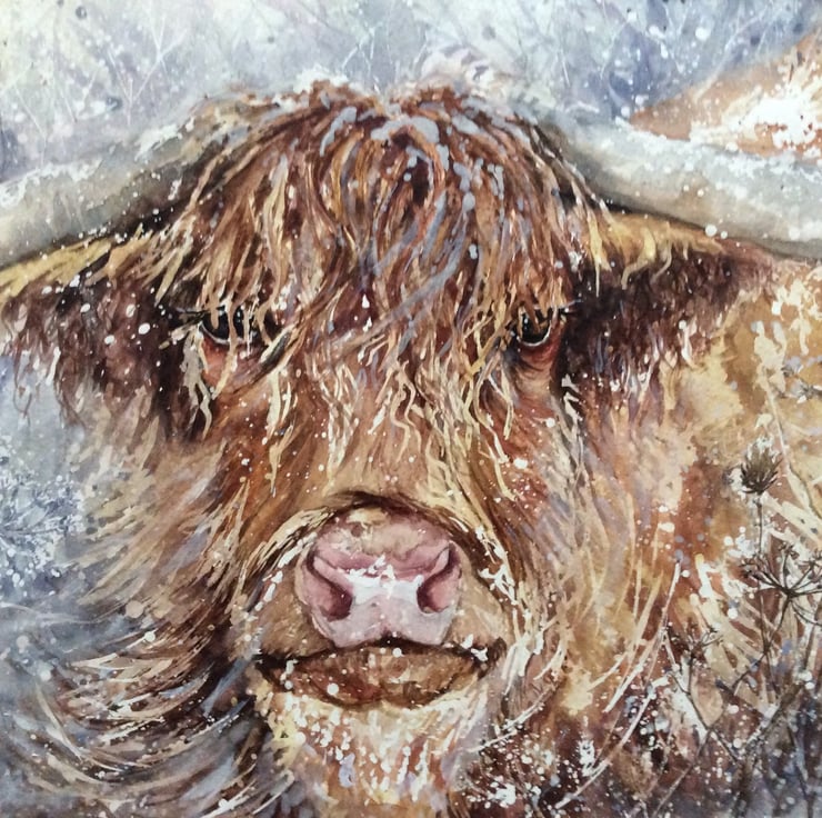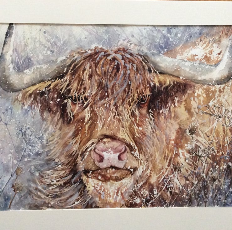 This atmospheric watercolour painting depicts a highland cow in a wintery setting created using wet on wet, resist and other watercolour techniques. The painting has been mounted so is ready to place directly into a frame. Measurements are approximately 40cm x 30cm. The painting will be securely flat packed between stiff card to arrive safely.