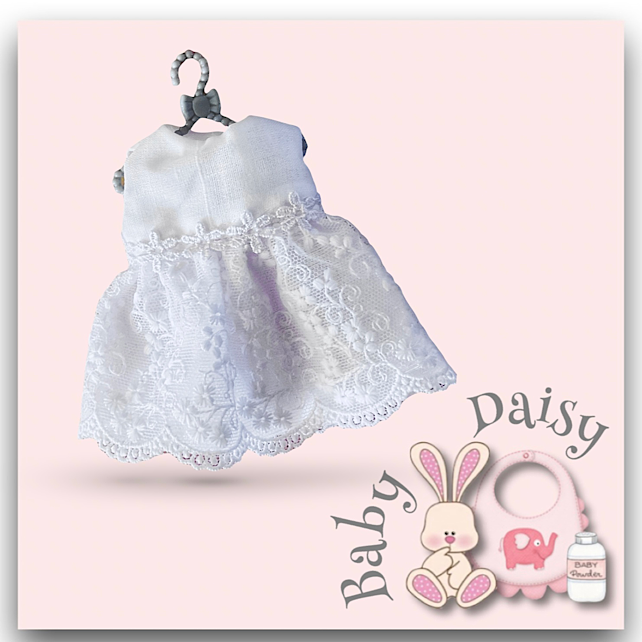 An adorable little pure while dress with a lace overlay for baby Daisy. The dress is handmade from best quality lace and cotton, has a lined bodice, is trimmed at the waist with tiny daisies and fastens at the back with a little popper