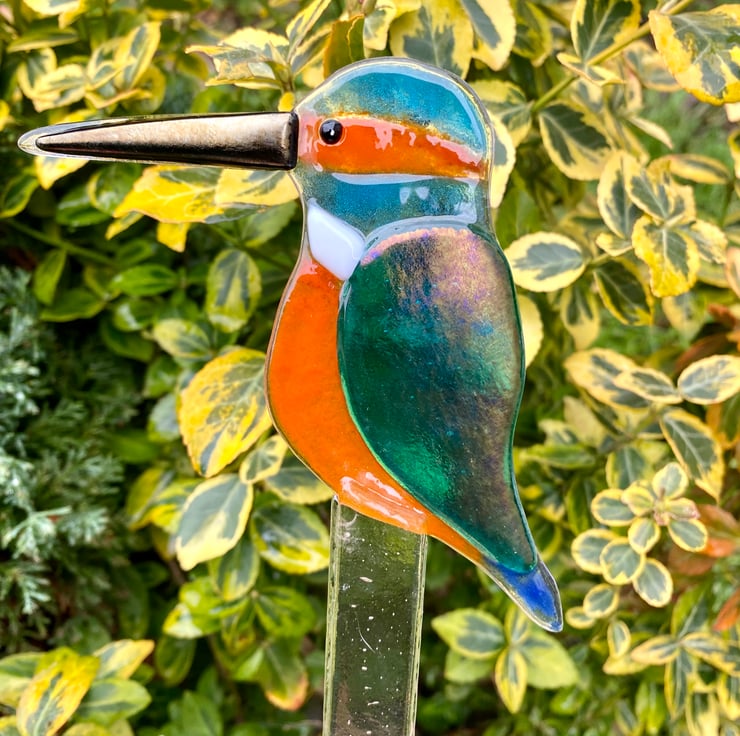A gorgeous fused glass iridescent Kingfisher garden pond or plant pot decoration.