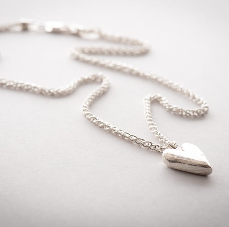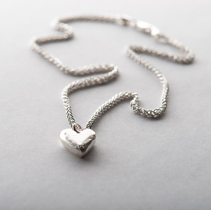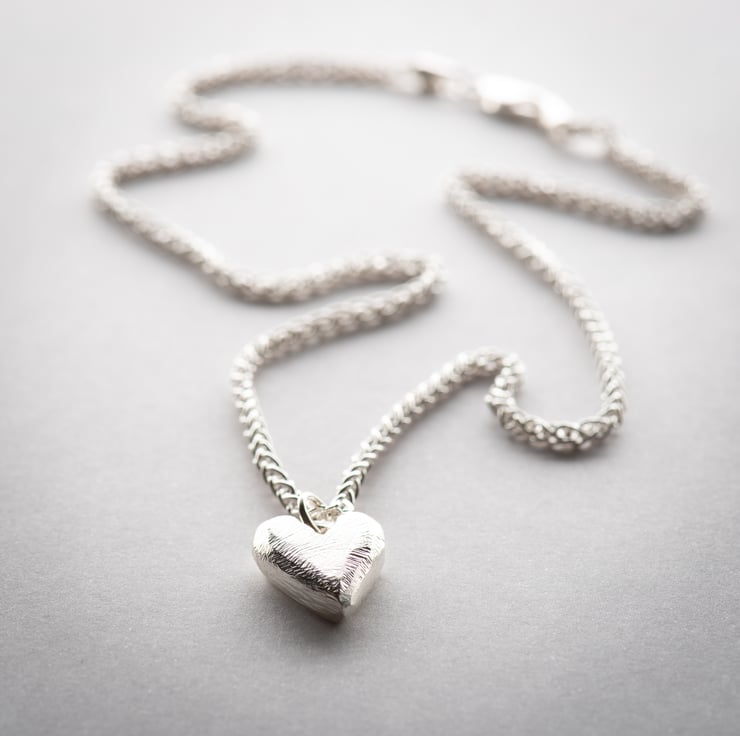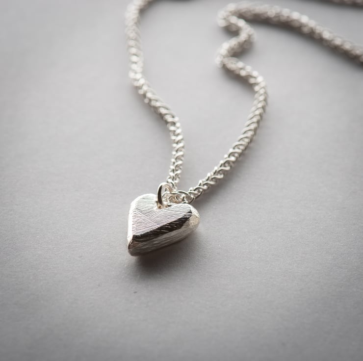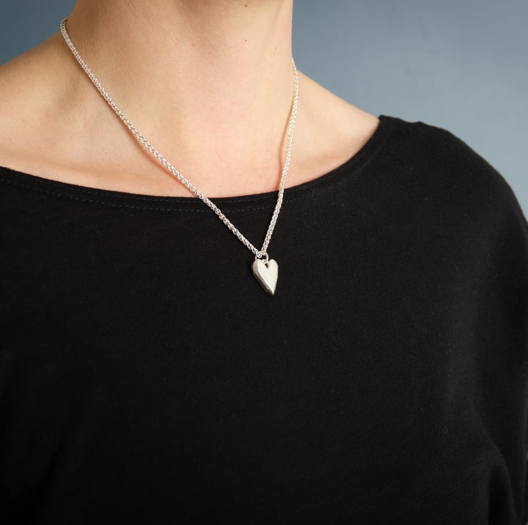 The pendant is completely unique. It was made using the method of lost wax casting - I carved the heart shape into jeweller's wax by hand, which was then cast into sterling silver. The original wax heart is melted down ('lost') in the process, leaving a solid silver heart in its place.