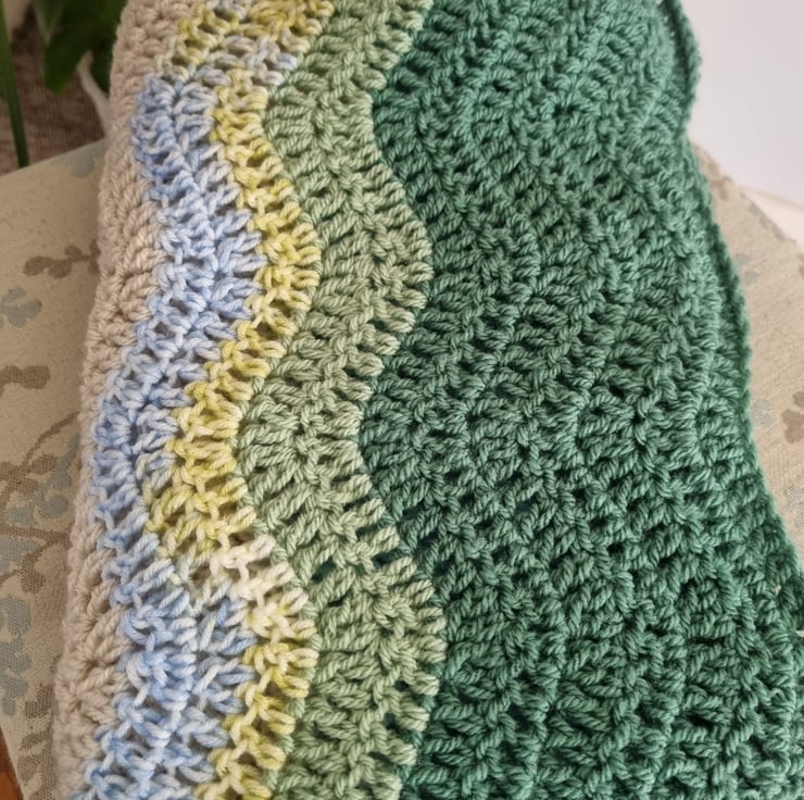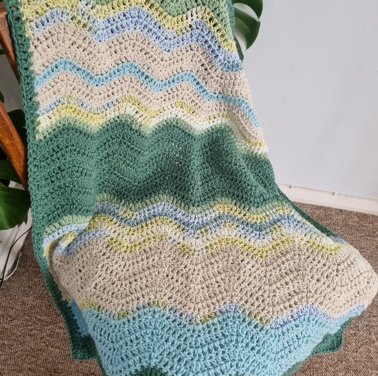Ripple design blanket, in shades of Sage, Aquamarine and beige. Super soft baby wool