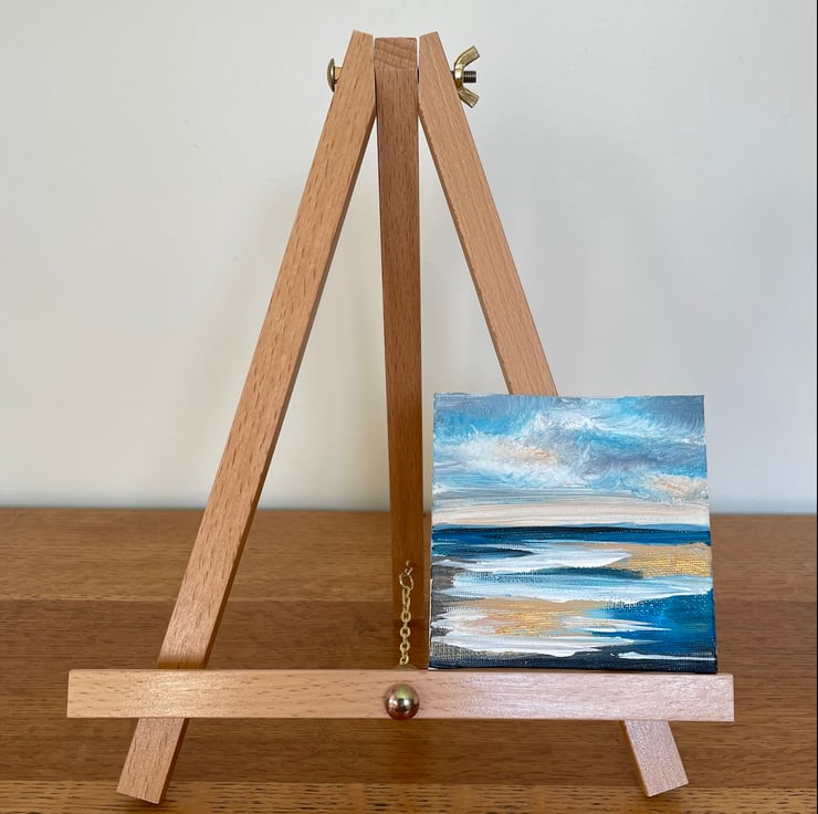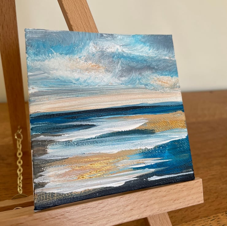 10cm square canvas board with a vibrant abstract seascape painting in acrylic paint mostly blues with a touch of gold for a subtle shimmer.