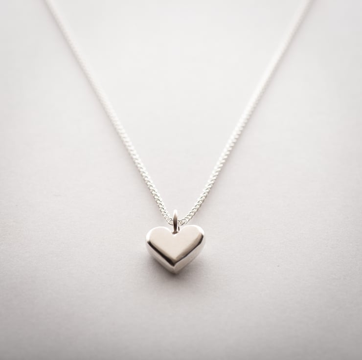 The chain is a sterling silver and measures 18 inches. The heart itself measures 1.2cm tall (1.5 with the loop) and 1.2cm across at the widest point.