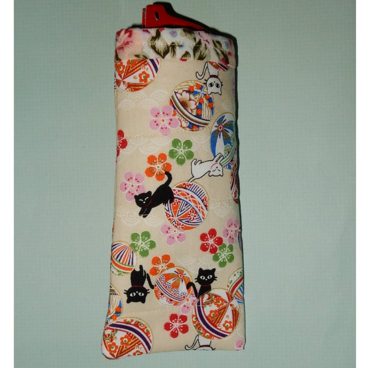 This beautiful glasses case would make a lovely gift for a friend or for yourself. It is made from a fabric featuring Japanese themed cats, balls and blossom, with a toning floral print for the trim and lining. It also has a layer of wadding for protection. This is a slip in style glasses case, if you require a case which fastens please view my other listings.