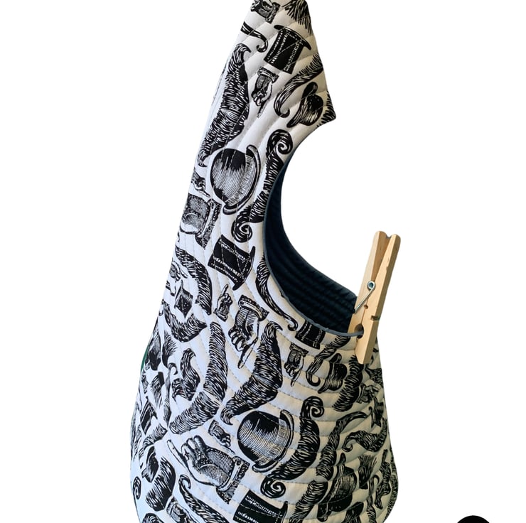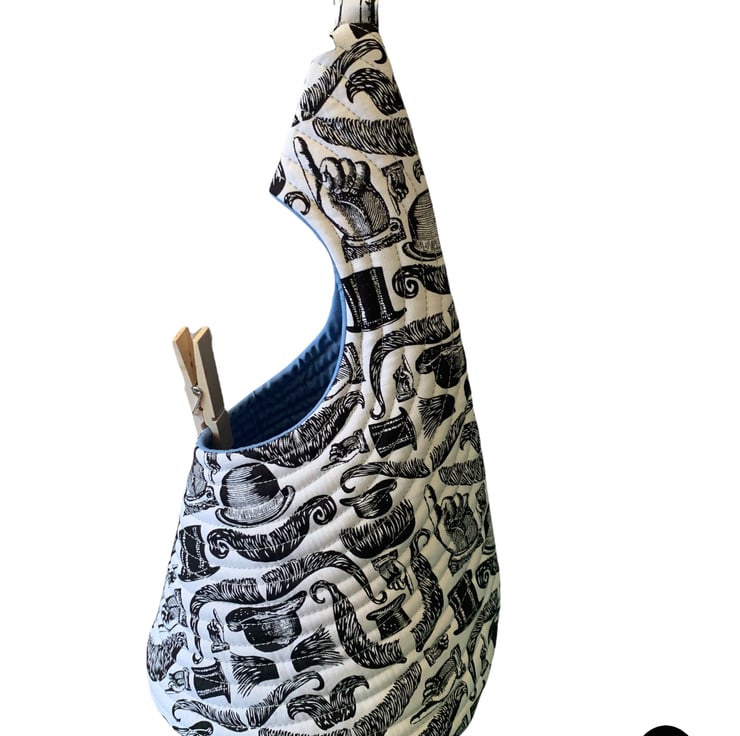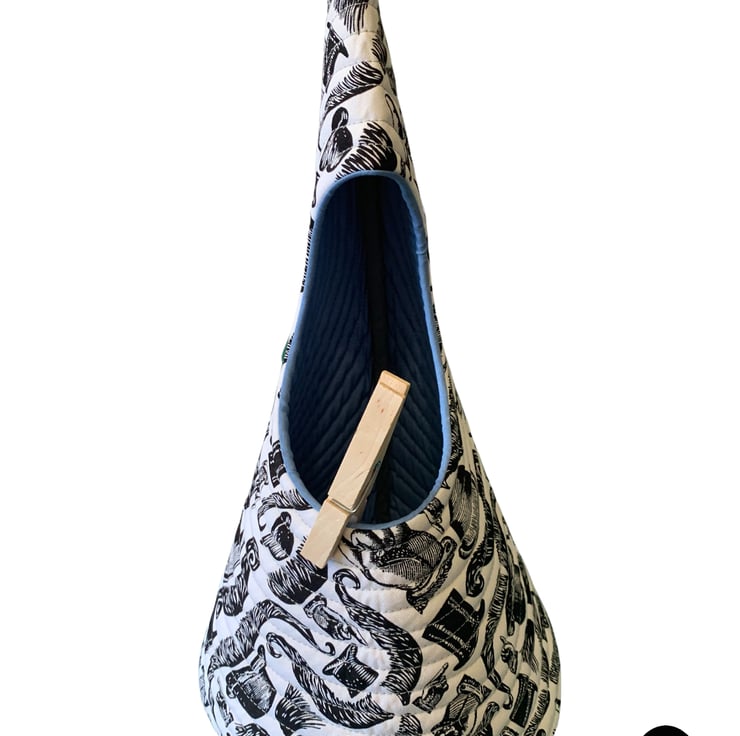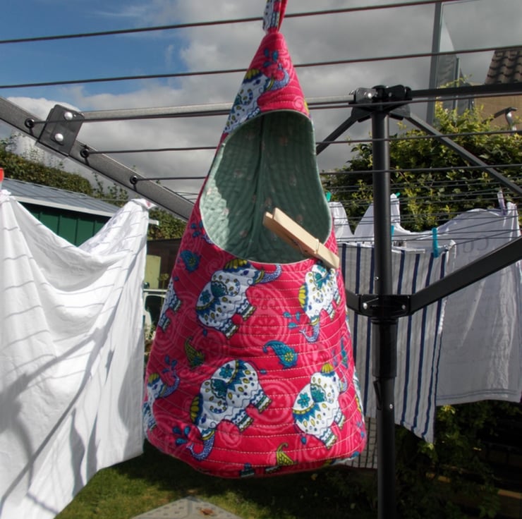 A peg bag with a difference. Fully quilted and comes with a carabiner clip to hook on your washing line or clip to a belt loop.