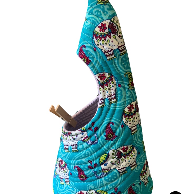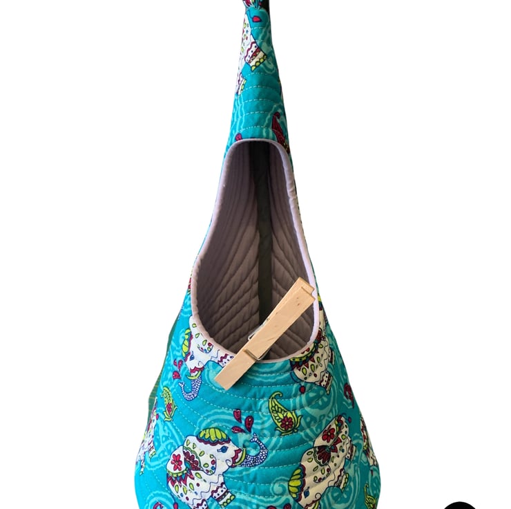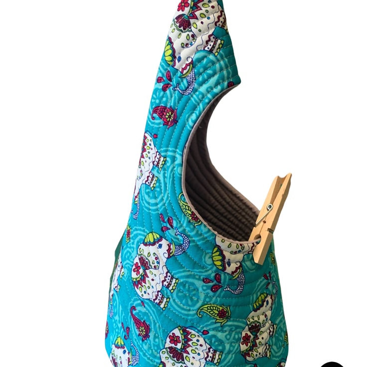 A peg bag with a difference. Fully quilted and comes with a carabiner clip to hook on your washing line or clip to a belt loop.