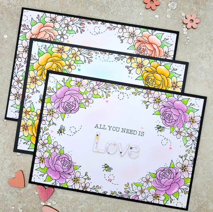 Measuring 12.5 x 17.5 cms, available in LILAC, CORAL PINK and HONEY GOLD. Please select at checkout. Finished with a subtle shimmer overlay, tiny hearts and bees with glossy wings. Unusually, I made three of these cards, as it was a joy to colour the design and I could not stop at just one!