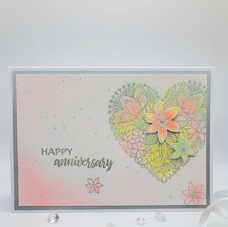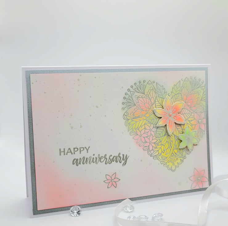 An individually handmade Anniversary Card in soft grey and pastel colours. The layered design is a mandala style floral heart, hand- stamped, heat embossed and blended with inks to create a soft finish. Flowers have been popped up with slim foam pads for a little dimension. This card is on sale at a reduced price as it is from an earlier collection.