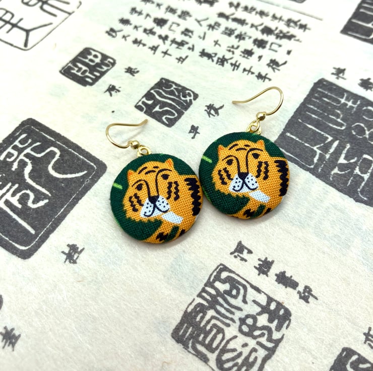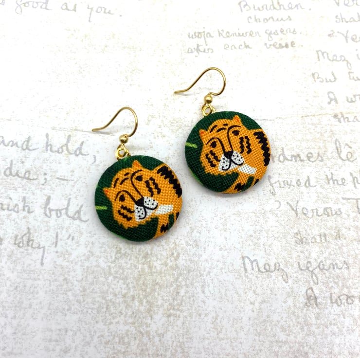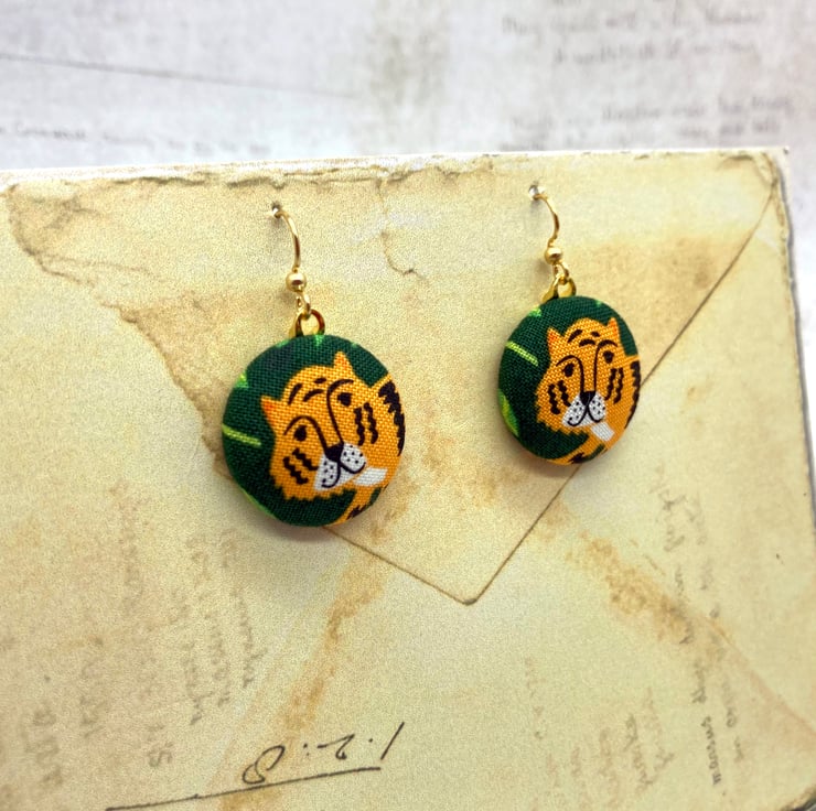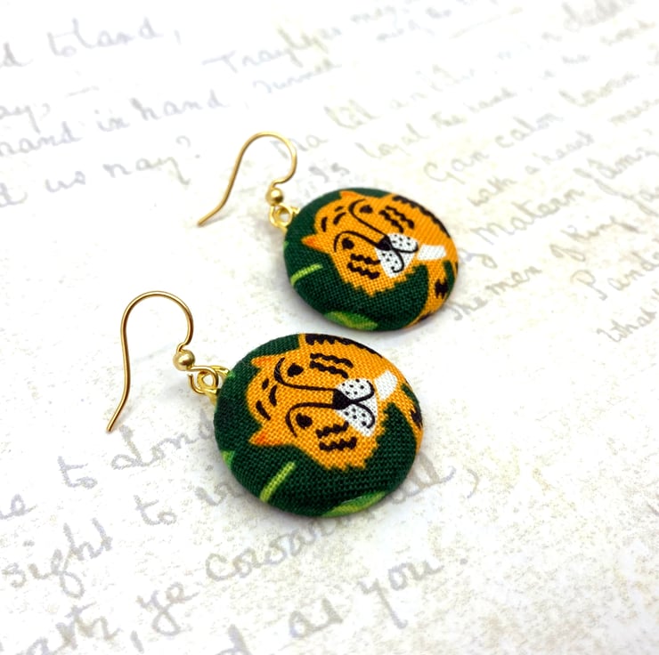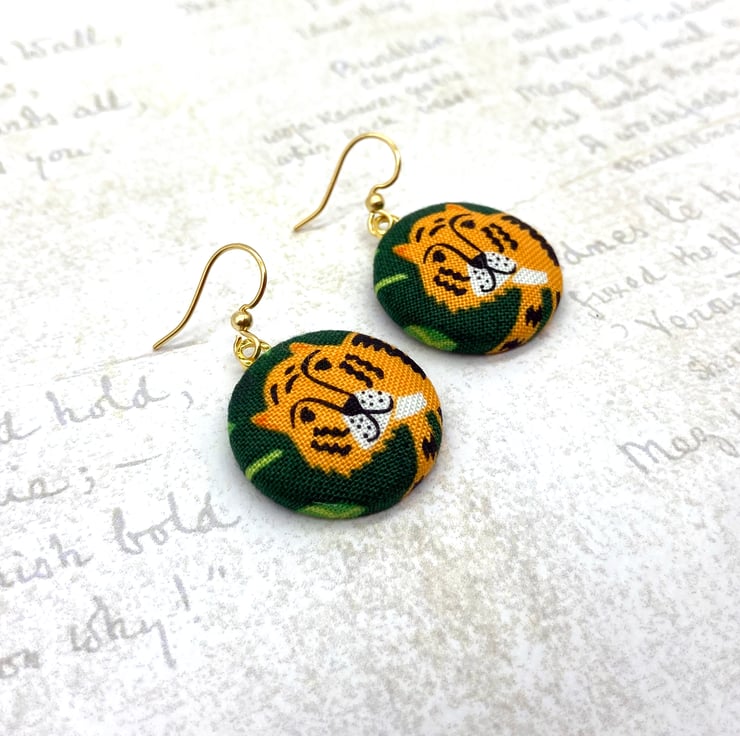 Perfect for the Year of the Tiger, are these cute tiger earrings! I've made these medium sized fabric buttons from a fun jungle-themed fabric that features, leopard, monkeys, parrots and these tigers on a dark green background, surrounded by jungle leaves.