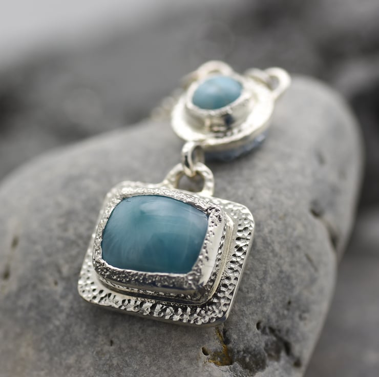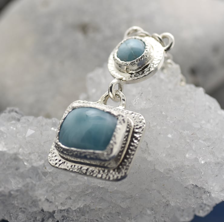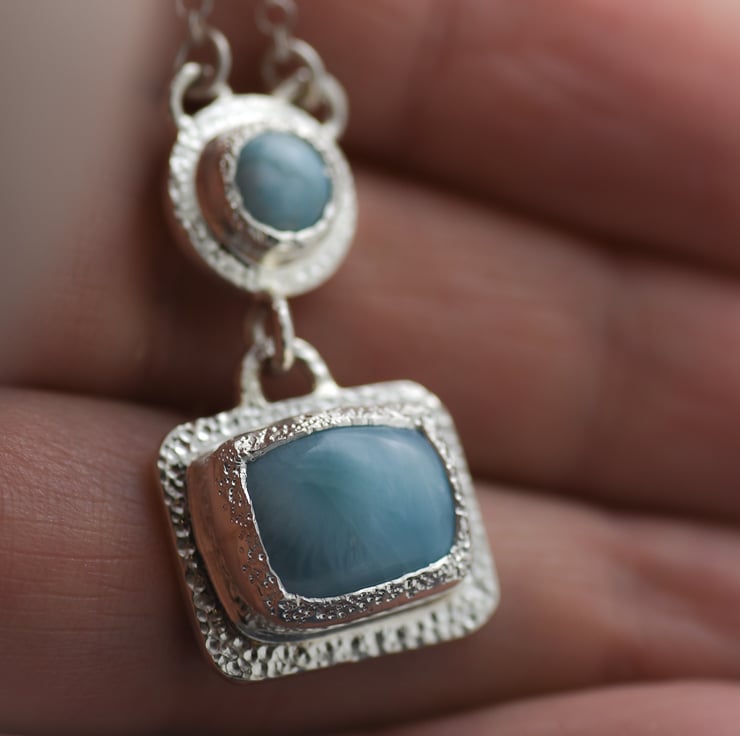 This one of a kind Larimar Pendant is made with a rustic texturing to the stone settings. The green/blue Larimar cabochons match perfectly with the white sheen of Argentium Silver. This is a medium sized pendant with a good weight.