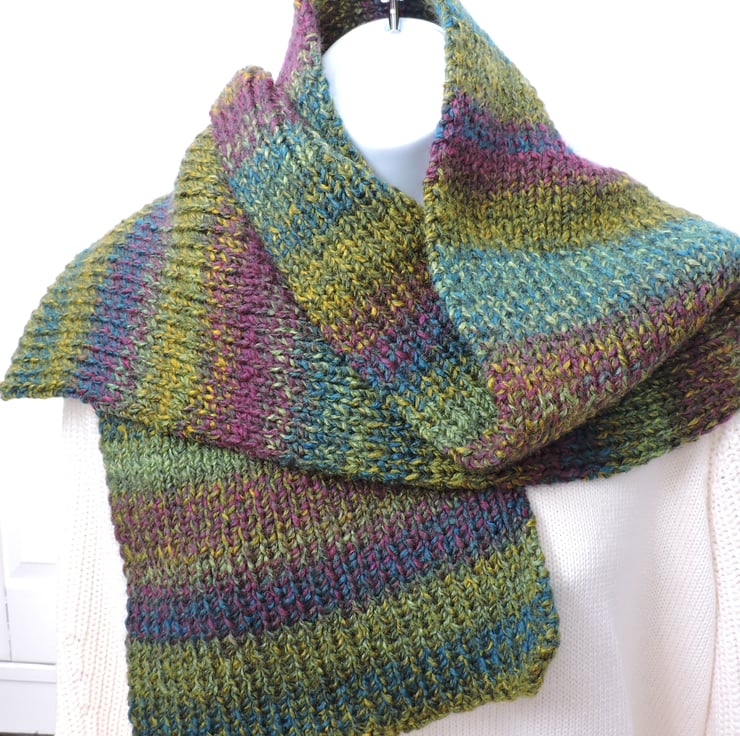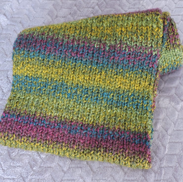 This wide scarf has been knitted with a lovely soft premium acrylic chunky yarn. A single rib pattern gives this scarf warmth and suppleness. Self striping melange colours of yellow, green, blue and magenta.