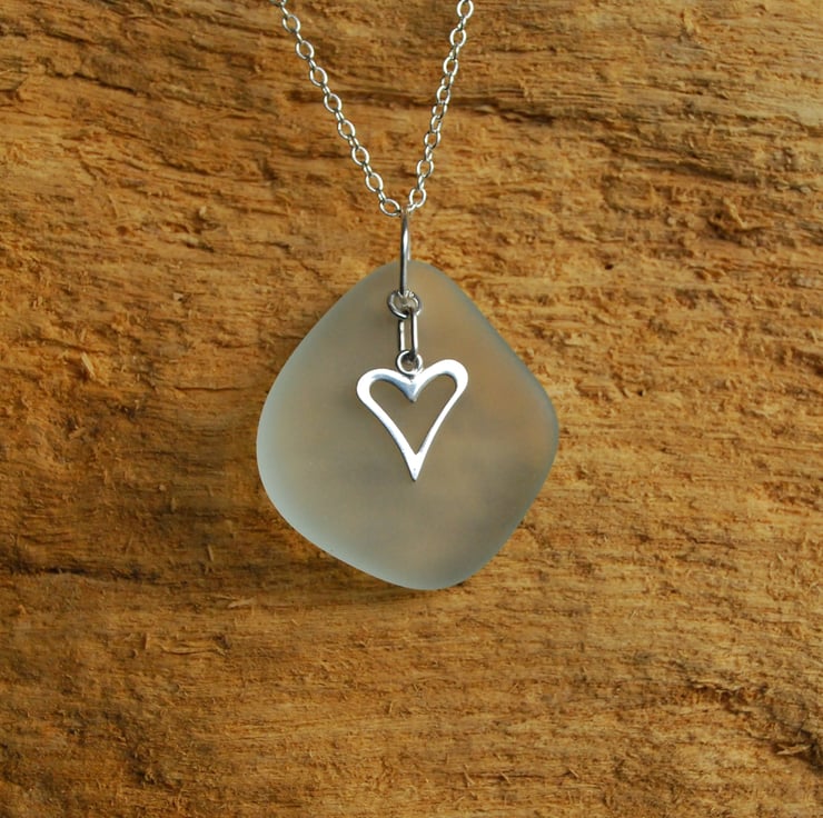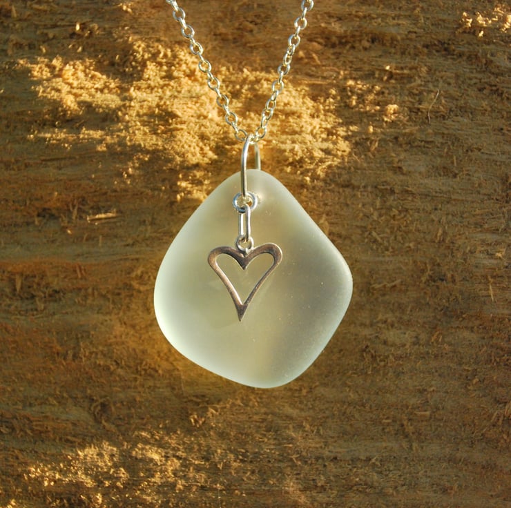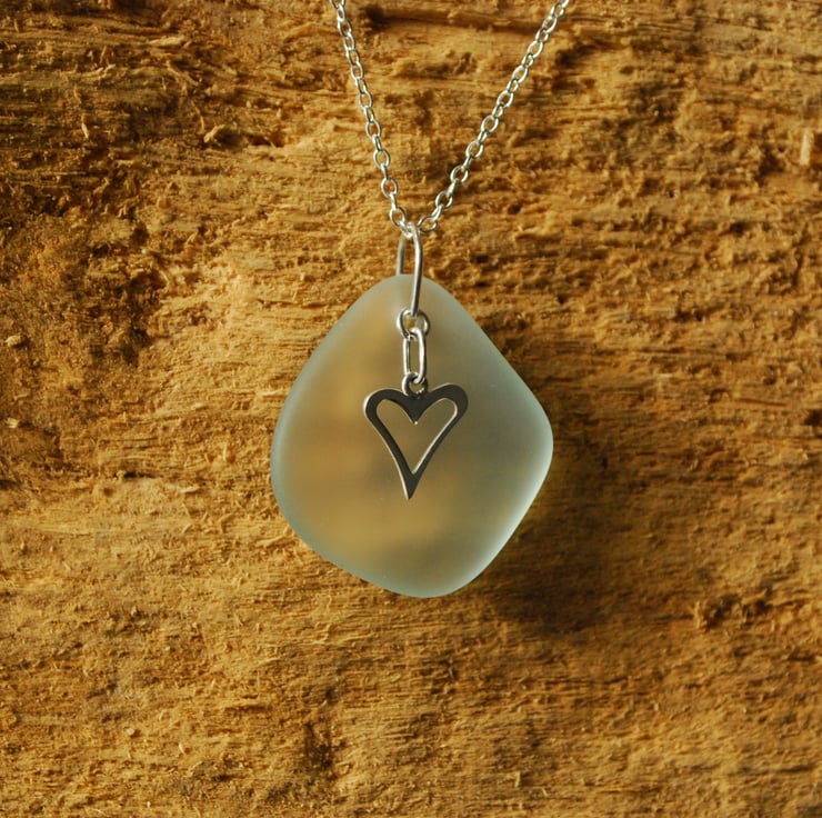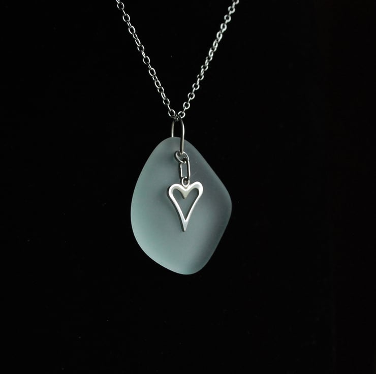 Pale aquamarine beach glass comes from old bottles. The thickness of the glass in bottles such as lemonade bottles means that broken pieces can be worn down on the beach so that they are rounded, such as the one in this pretty pendant. This piece of tumbled beach glass has a gentle curve, which looks lovely behind the sterling silver charm.