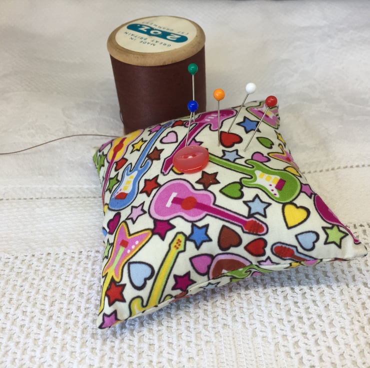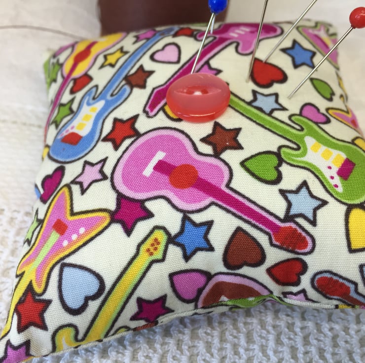 Fabric with a multicoloured guitar pattern is used to make this simple pin cushion. Centre is a pinky red vintage button.