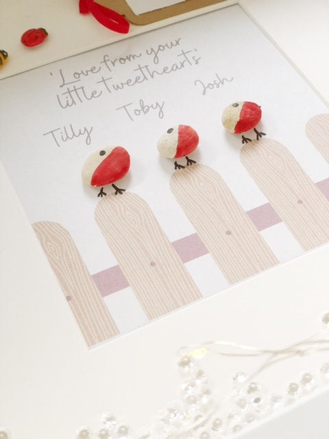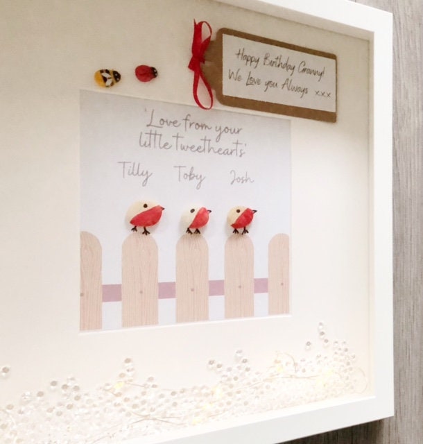 Handmade with pebble pieces. Each frame comes with sparkly gems. Fairy lights can be added as an optional extra