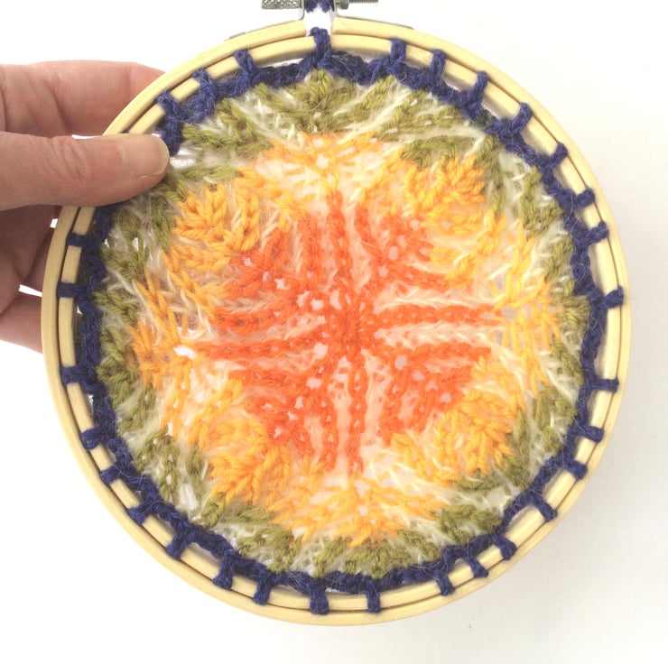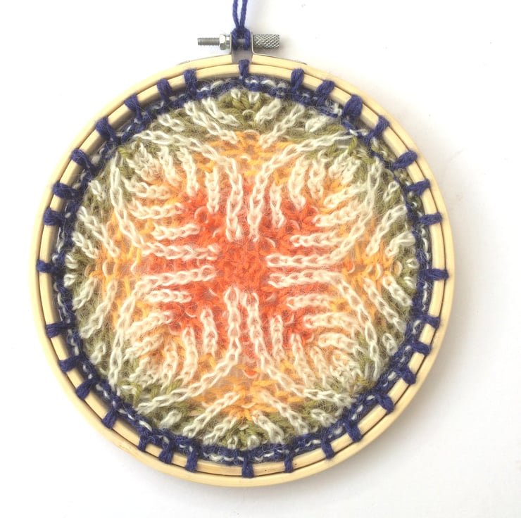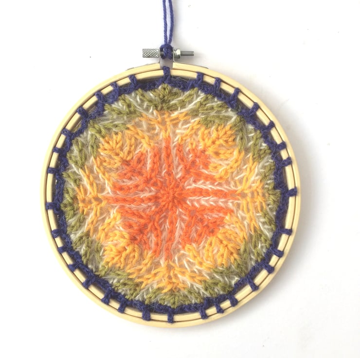 Brioche knitted 2 coloured mandala attached to an 7" embroidery hoop. Yarn used is a mix of bright colourful 100% British wool yarn and white mohair yarn.