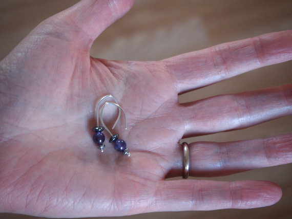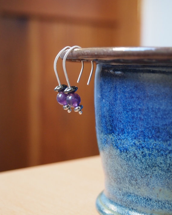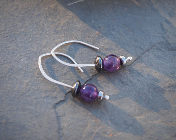 Purple amethyst spheres have been teamed up with small hematite beads to make these simple drop earrings.