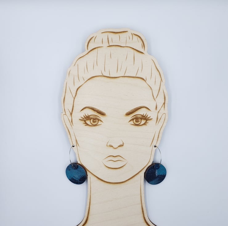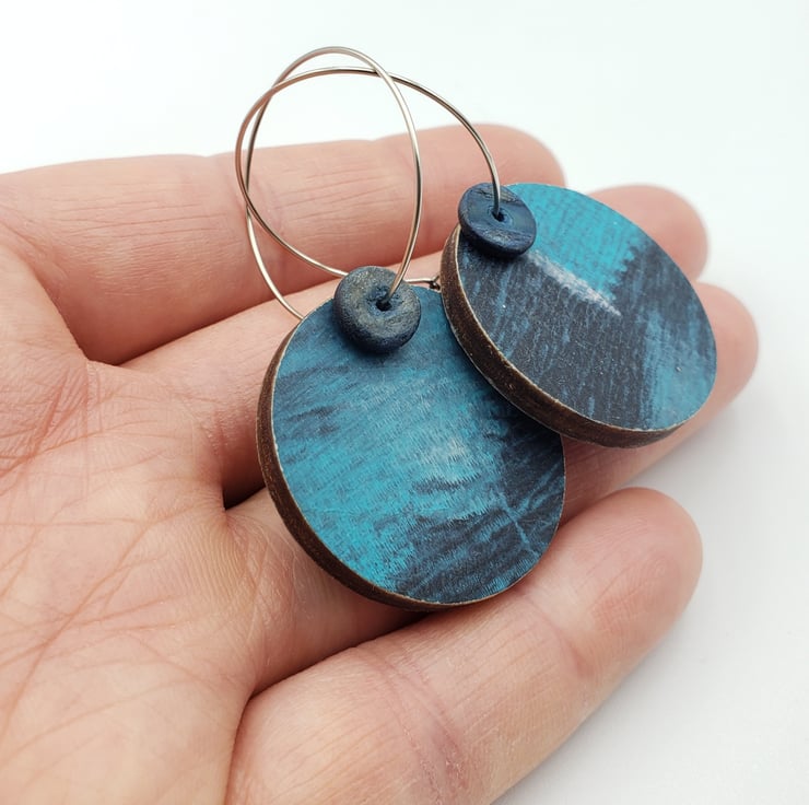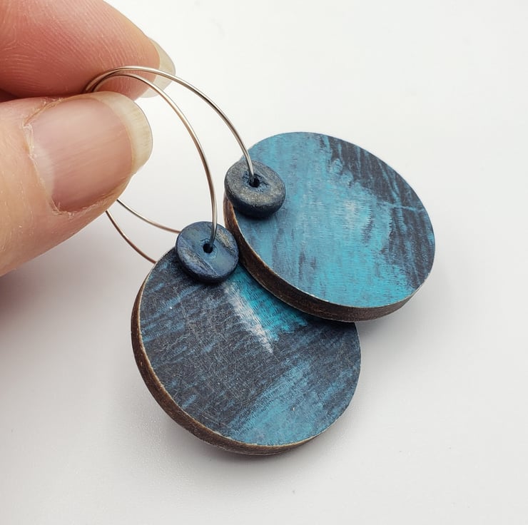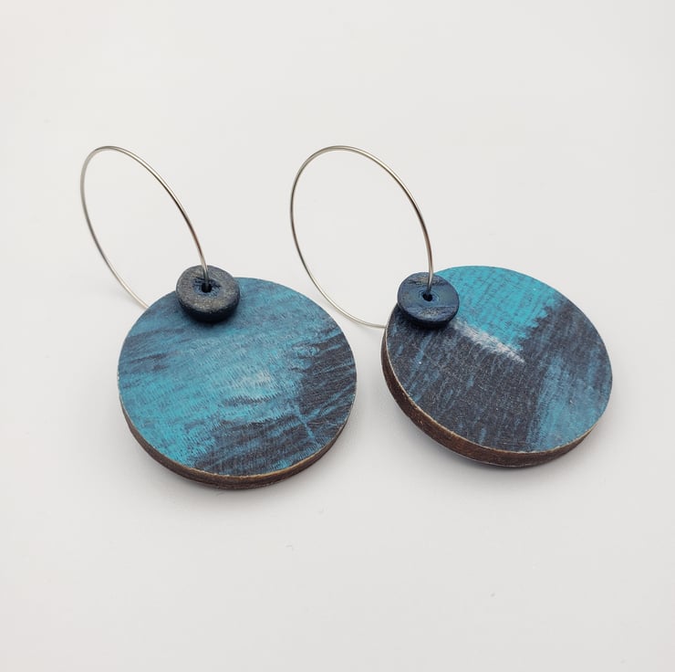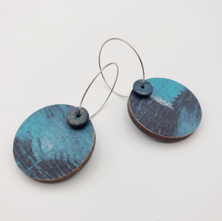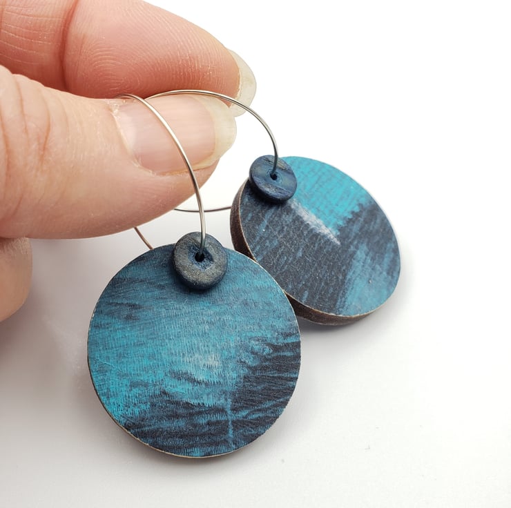 Hand printed earrings in a selection of blues including, dark blue, turquoise and white. I first print on paper which is then glued onto a birch wood disc and coated with varnish to protect.