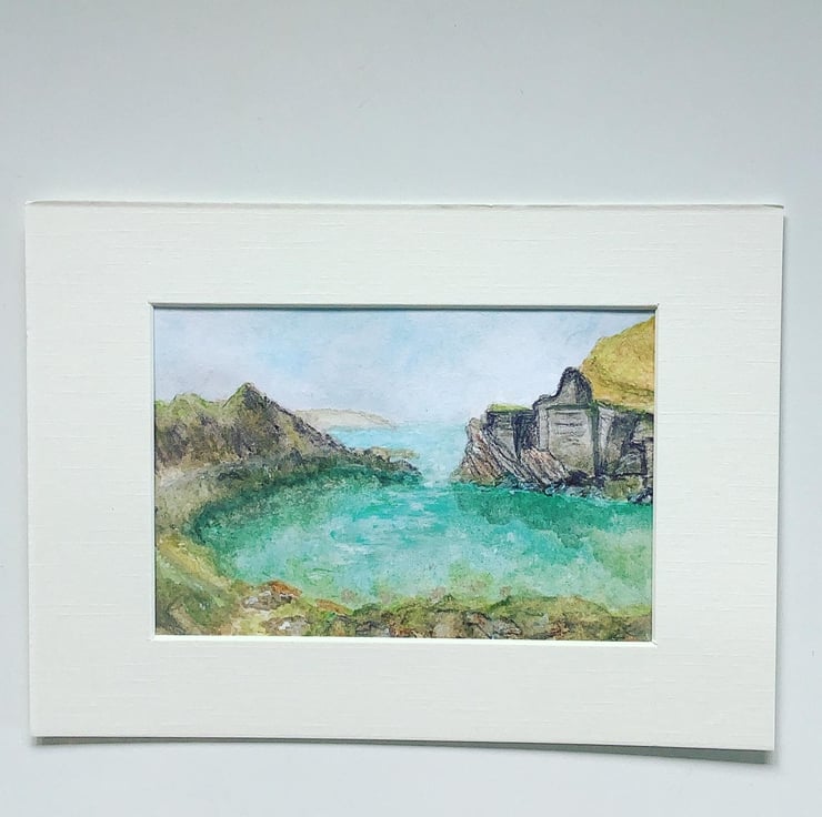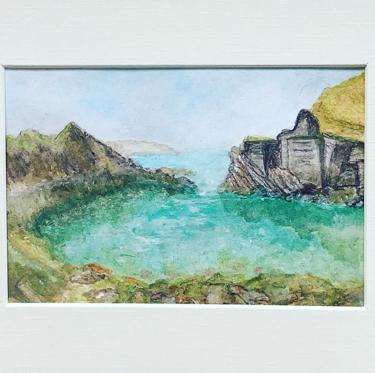 An original, watercolour painting of the Blue Lagoon, Abereiddy. Painted on 170gsm paper and mounted.