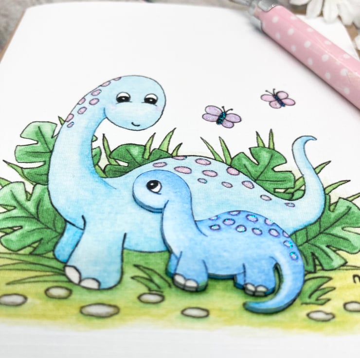 This cute dinosaur card has been designed using my own original illustration. The image has been printed out onto good quality white linen embossed card and decoupaged up in parts. I have also added a little glitter detail.