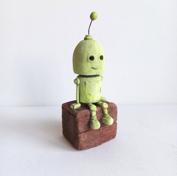 A cute ceramic robot sitting on a wooden box with a little flower pot sculpture. Made entirely from terracotta clays and decorated with various slips and stains.