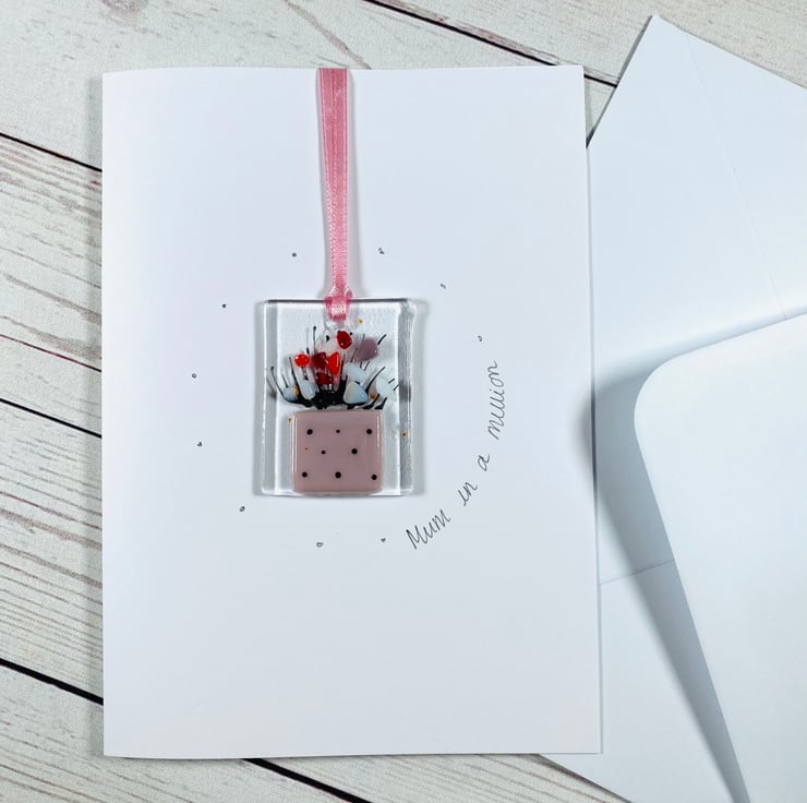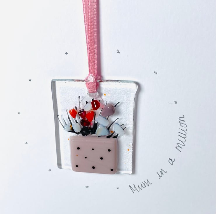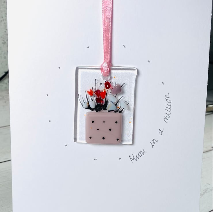 Pretty handmade fused glass keepsake card for Mother’s Day . Once the day is over give you mum a glass flower hanging to remember you by . The glass hanging is 2 in x1 inch , drilled and strung with ribbon and ready to hang in your home (even your Christmas tree) . The card is in a cellophane cover with envelope